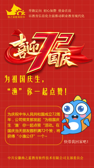 为庆祝中华人民共和国成立72周年,渔之蓝党支部发起“为祖国庆生 ‘渔’你一起点赞”的庆国庆送祝福活动!公司全员参与,表达最真挚的爱意和祝福,庆祝新中国成...